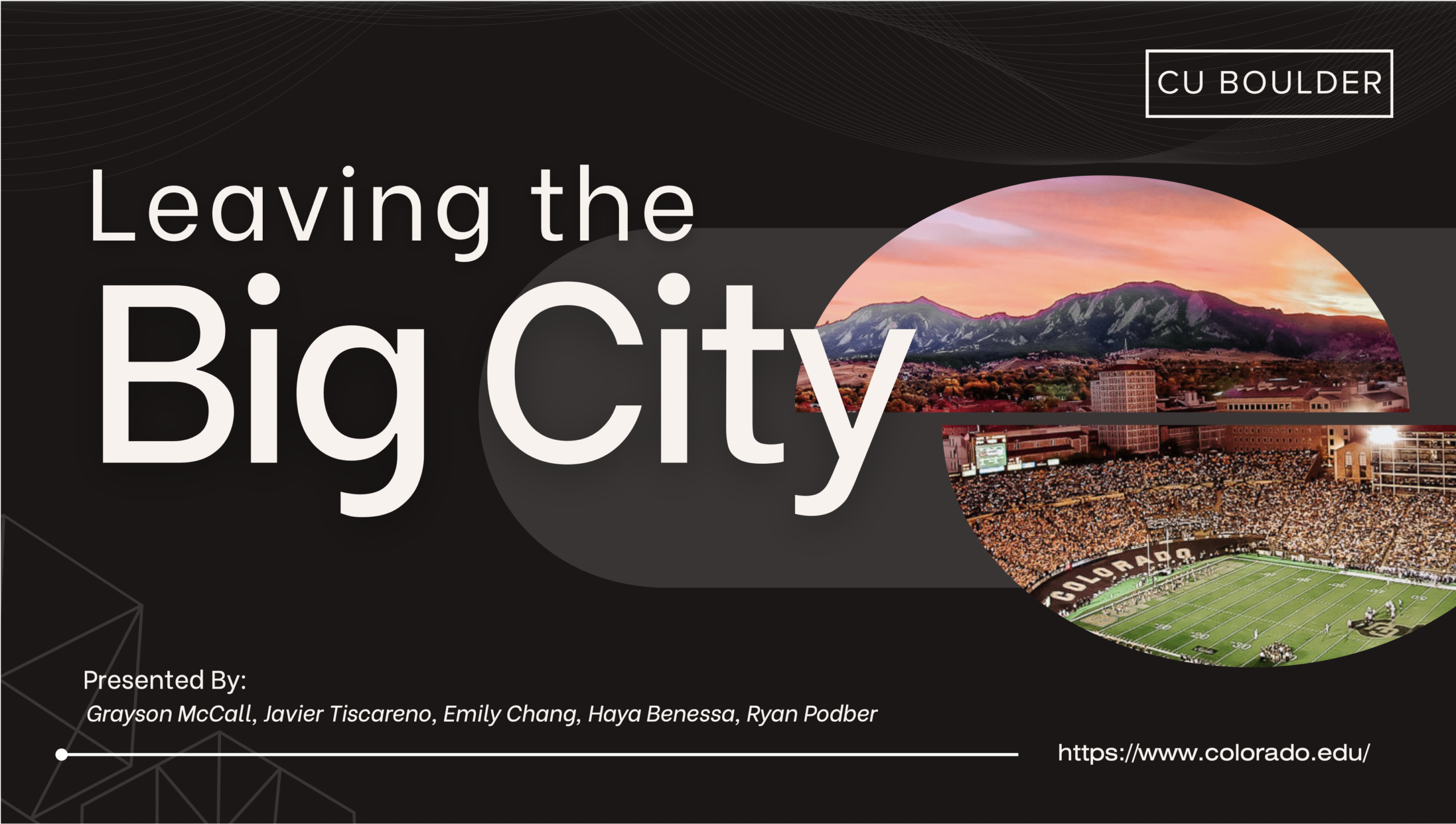 The “Leaving the Big City” presentation introduces the core marketing strategy developed to engage prospective students from urban environments who are seeking a more balanced and enriching college experience. The presentation begins with audience insights identifying key decision factors—such as affordability, location, quality of life, and student outcomes—which influence university selection. It then outlines a multi-platform campaign centered around social media engagement, poster advertisements, and targeted YouTube content designed to highlight CU Boulder’s campus environment, outdoor lifestyle, and academic strengths. The strategy is informed by communication theory, including priming and peripheral processing within the Elaboration Likelihood Model, which guides the campaign’s emphasis on emotionally engaging visuals and concise messaging. The presentation also includes a phased implementation timeline that builds brand awareness through social media before transitioning to more informational video advertising, creating a layered marketing funnel that gradually deepens audience engagement and brand familiarity.